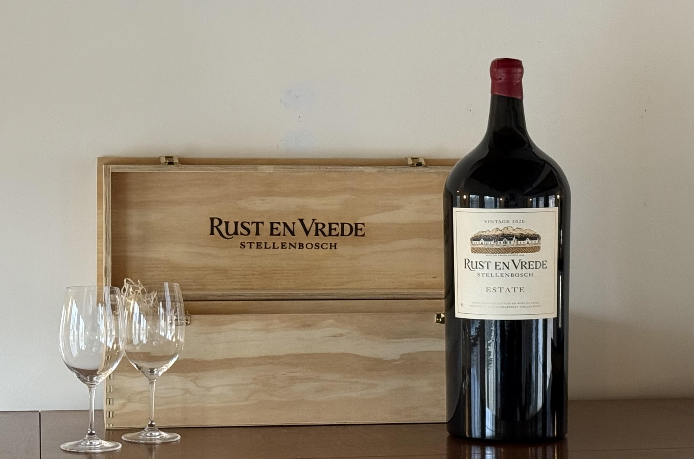 Plan your next dinner party around this Salmanazar (9 liters!) from leading South African wine estate Rust en Vrede. Selected four times as one of the top 100 wines in the world, their Estate Wine 2020 is uniquely produced and blended in proportion to the vineyard's planting: 64% Cabernet Sauvignon, 28% Syrah, 8% Merlot.